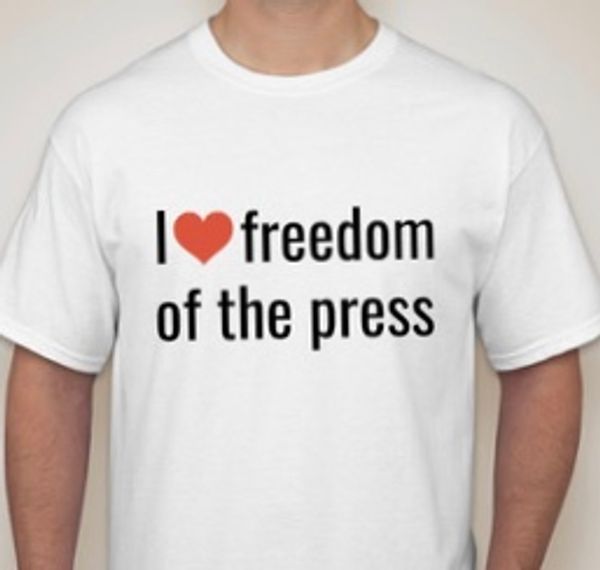 Show your support for Freedom of the Press and the First Amendment with this 100% cotton T-shirt. Email your size preference (S, M, L, XL) to info@iheartfreedomofthepress.com.